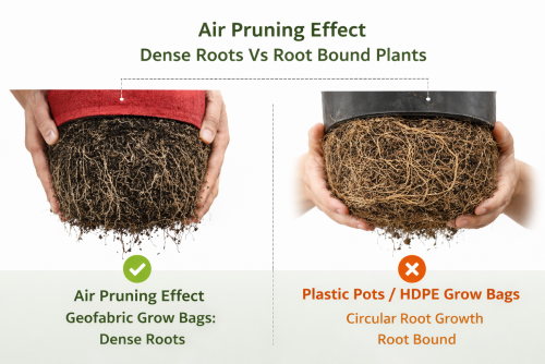 Geo fabric allows natural air pruning, which helps roots grow thicker and healthier instead of becoming tangled. This results in stronger plants, better nutrient absorption, and higher yield compared to plastic pots.
